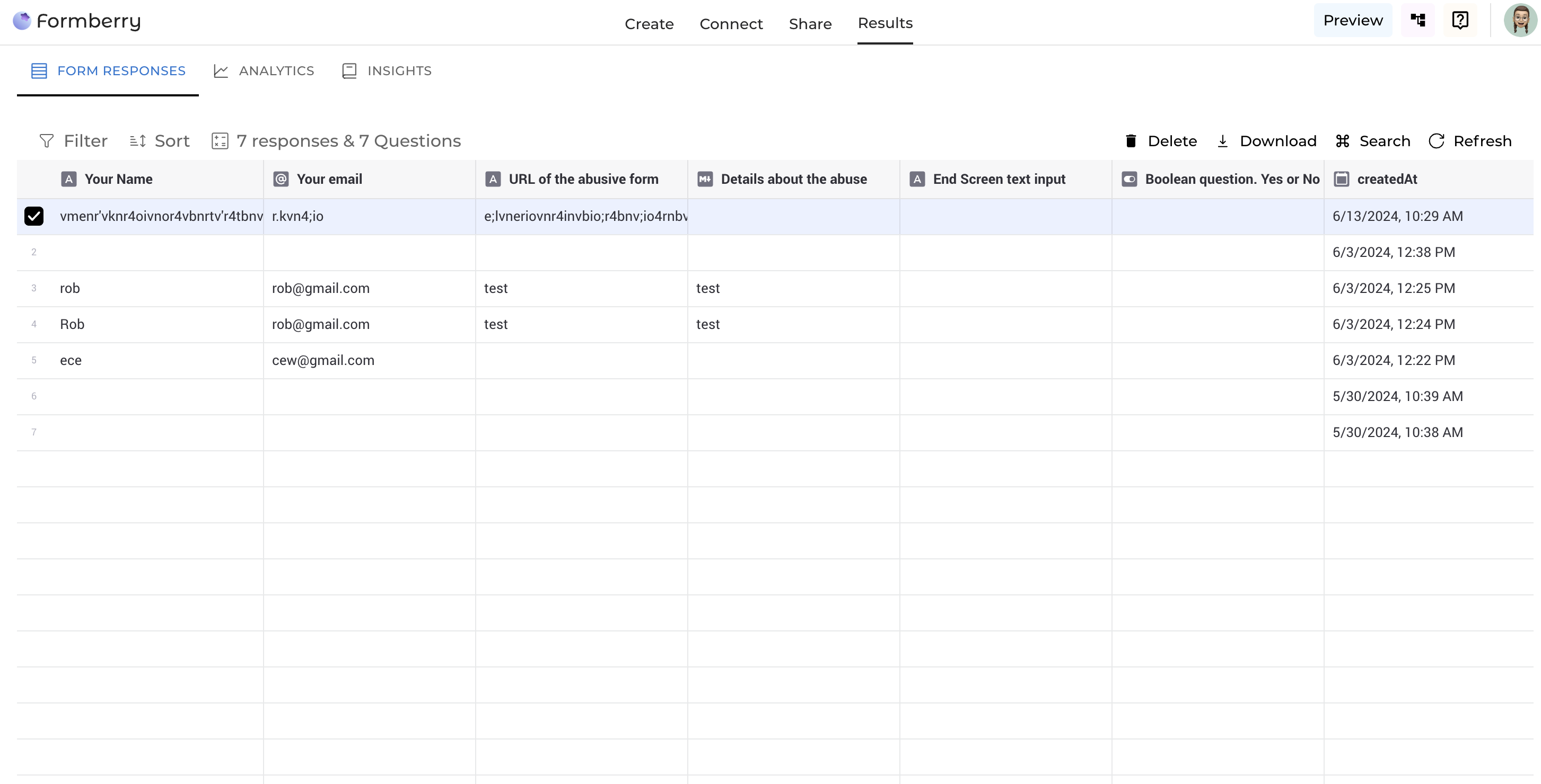 Under your responses, select row(s) and click '**delete**'.